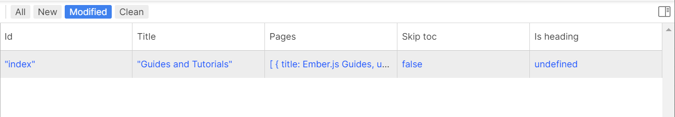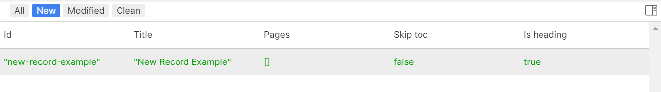 The Data tab is kept in sync with the data loaded in your application. Any record additions, deletions, or changes are reflected immediately. If you have unsaved records, they will be displayed in green by clicking on the New pill.