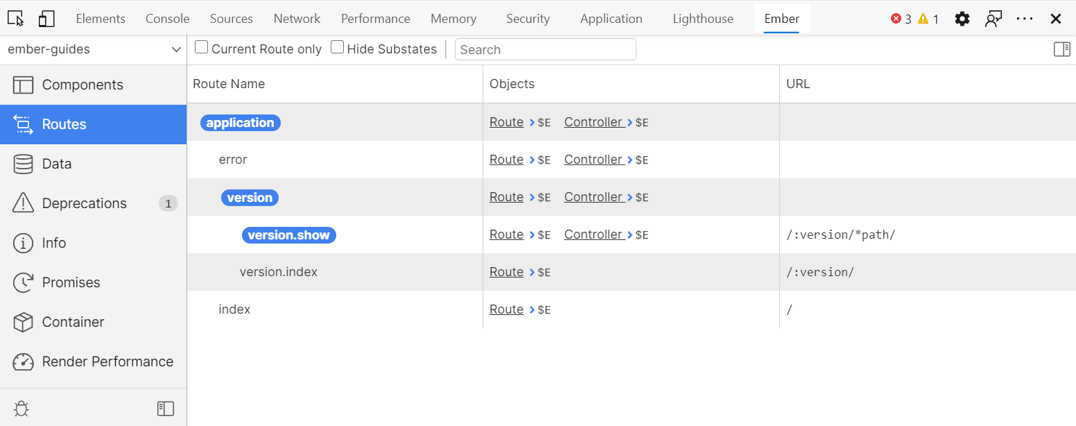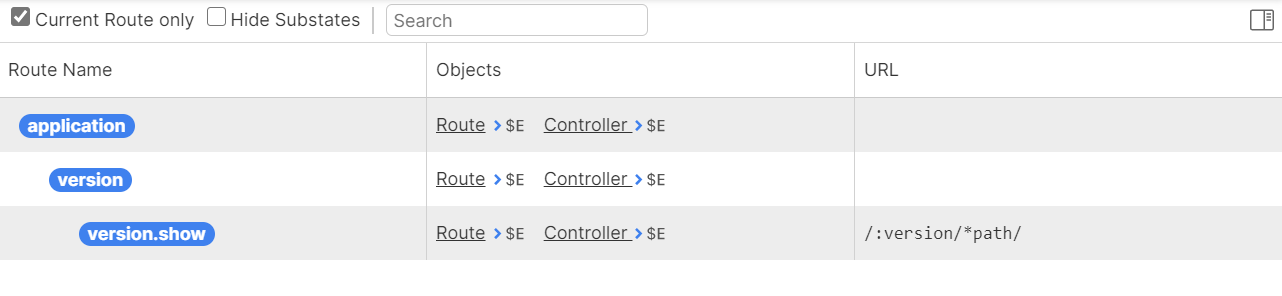 As you can see, the Inspector shows the routes you defined as well as the routes automatically generated by Ember.