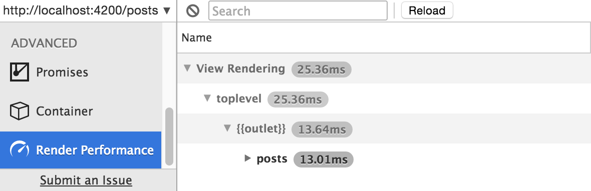 To measure components and templates that are rendered on initial application boot, click on the "Reload" button at the top. This button ensures that the Inspector starts measuring render times when your app boots.